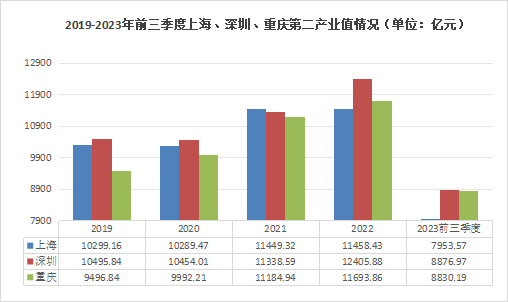 从今年前三季度的第二产业增加值来看,重庆对深圳已经是步步紧逼的状态。在接下来的发展过程中,就算不能在2023年第四季度反超深圳,重庆的第二产业增加值也很有可能在未来超过深圳。